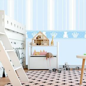 Papel De Parede Listrado Azul Com Coroa E Urso Adesivo Bebê