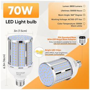 Ilumine seus ambientes com as Lâmpadas de Milho LED XYCN 70W, projetadas com chips de LED de alta qualidade e sistema de controle térmico para uma vida útil de mais de 55.000 horas. Com Índice de Reprodução de Cor de 85, as cores são visualizadas com precisão. Com design sem ventilador, dissipação rápida do calor e ângulo de feixe de 360 graus, oferecendo 8.800 lumens de brilho. Ideal para garagens, galpões, pátios, supermercados, fábricas e muito mais. Fácil instalação e eficiência energética de 85%. Aproveite a durabilidade e eficiência energética desta lâmpada moderna!