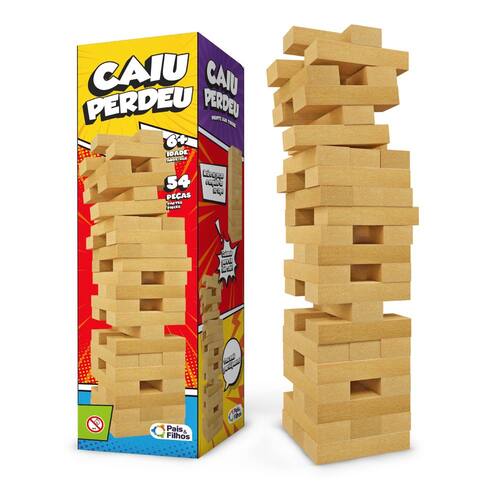 O Caiu Perdeu 54 Peças Pais & Filhos é a versão familiar do clássico Jenga, um jogo de equilíbrio em madeira que diverte toda a família com tensão e risadas em cada jogada.
