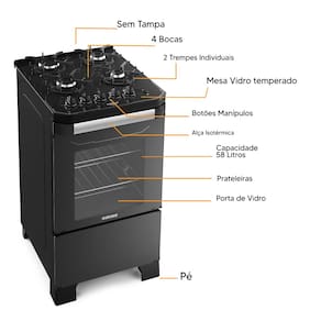 Com mesa em vidro temperado, trempes robustas em ferro fundido e forno espaçoso, ele oferece mais estabilidade, durabilidade e facilidade na limpeza, tornando o preparo das refeições muito mais prático.