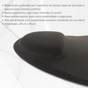 Material de qualidade com superfície em tecido, base de borracha e espuma para máximo conforto Apoio ergonômico que reduz a tensão no punho Base antiderrapante para maior estabilidade e segurança Alta durabilidade com acabamento premium resistente ao uso diário Dimensões: 24 cm x 19 cm