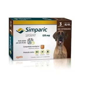 2 Antipulgas e Carrapatos Simparic 120mg Cães 40,1 A 60kg C/3 Comprimidos O antipulgas zoetis simparic 120 mg para Cães 40,1 a 60 kg utilizado para o tratamento das infestações por pulgas e sarna sarcótica. Após a administração do Simparic, a sua atividade contra pulgas dura, pelo menos, 5 semanas. O também pode ser utilizado como parte de uma estratégia de tratamento para o controle da dermatite alérgica por picada de pulga uma reação alérgica às picadas de pulga . Contém a substância ativa sarolaner. - Mata as pulgas antes que produzam ovos - Controle de dermatite alérgica por picada de pulga DAPP ; - Possui ação rápida: fazendo efeito em 3 horas, mantendo-se por até 35 dias; - Combate também três tipos de sarnas: Sarcópticas, Demodécica e Otodécica; - Indicada para cães a partir de 8 semanas de idade e com acima de 1,3 Kg; - Pode ser utilizado em cachorros de portes e raças diferentes; - Sim, Simparic extermina carrapatos e pulgas instantaneamente e age alem do período de tratamento mensal -simparic é eficaz contra 11 espécies de carrapatos Marca: Não Informado