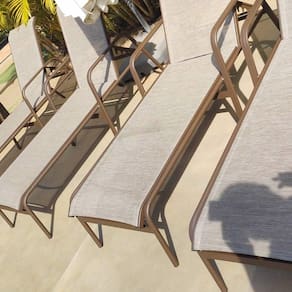 As espreguiçadeiras Sevilha possuem estrutura em alumínio que não enferruja, encosto regulável até 5 posições, acabamento resistente ao sol, chuva e maresia, além da tela sling ventilada que oferece comodidade e fácil manutenção.
