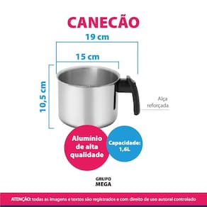 Canecão fervedor leiteira de alumínio polido, perfeito para esquentar água, chá e leite 1,6L Composição do kit: 2 Canecão de 1,6L Praticidade e durabilidade para o seu dia a dia Nosso canecão de alumínio é perfeito para ferver e esquentar água, leite e outras bebidas com rapidez e eficiência. Feito de alumínio leve e resistente, garante um aquecimento uniforme, além de ser fácil de manusear e limpar. Ideal para uso doméstico ou , ele é um item indispensável na sua cozinha. Garanta já o seu e facilite sua rotina Características: Canecão médio para esquentar água ou leite com capacidade de 1,6L Feita de alumínio polido de alta qualidade Alças reforçadas Prático Durável Aquecimento rápido e uniforme Certificada pelo Inmetro 427/2019 Acompanha manual de uso Compre nesse anúncio com segurança pelo Grupo Mega, somos um e-commerce com mais de 20 anos de atuação. Especificação: Modelo: Canecão médio Marca: Erca / GH3 Material: alumínio e polipropileno Capacidade: 1,6L Embalagem: plástico envolto não possui caixa Tamanho: Largura total: 19cm contando com a alça Altura: 10,5cm Diâmetro da caneca: 15cm Peso total: 177g. Obrigado pela visita e boas compras ATENÇÃO Nossas imagens e textos são registrados e com direito de uso autoral controlado e reservado a essa loja e as lojas parceiras devidamente autorizadas em contrato.