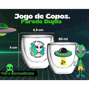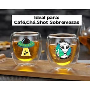 Especificações: Altura: 6cm Diâmetro da boca: 6.5cm Capacidade: 80ml Material: vidro borossilicato Contém: 2 copos de cada estampa escolha sua variação Marca: Não Informado