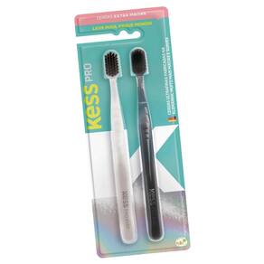 As escovas da linha Kess Pro possuem: Alta eficiência na escovação- tem o maior número de cerdas de alta qualidade que garantem limpeza profunda dos dentes, projetadas para alcançar até mesmo os espaços mais difíceis, garantindo limpeza completa. Cerdas extra macias e ultrafinas que proporcionam uma escovação gentil, ideal para dentes e gengivas sensíveis, que garantem uma escovação suave. Design Moderno, estético e funcional com cabo reto e cabeça angulada disponível nas cores branco e preto. Economia: Pack duplo para maior durabilidade acompanha capa protetora de cerdas. Proporciona precisão e conforto na escovação.