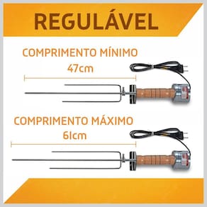 Espeto Giratório Elétrico 127V Rotary Speto=======================================================================Use em vários lugares: em casa, na praia, no campo, no churrasco do futebol.Ele é prático.Super resistente!Design Exclusivo com motor proporcional ao cabo, não atrapalha na hora do uso!=======================================================================Com regulagem mínimo 47cm e máximo 61cmSuporta até 3,5kg de carneChapa de apoio frontal InoxCabo de madeira MaciçaVoltagem 127VBaixo consumo de energiaDispense o uso de pilhas com o Rotary Speto Elétricol!=======================================================================Cabo de energia não removivel, com 1,35m de comprimentoNão possui botão de liga/desliga=======================================================================Motor 4 RPM