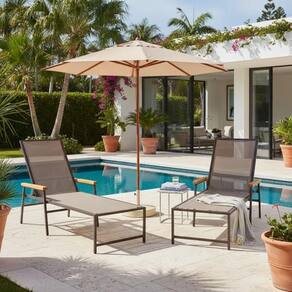 Transforme sua área externa em um espaço sofisticado e confortável com o Jogo 2 Espreguiçadeiras Amélia em Alumínio com Tela Sling e Braços em Madeira + Guarda-Sol de 3,00m com Base de Concreto.