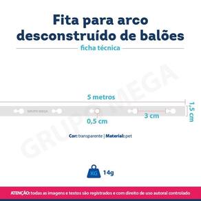 Especificações técnicas: Marca: GH3 Festas e Eventos Modelo: Fita para arco desconstruído de balões 5m Quantidade: 1 unidade Material: PET Cor: transparente Comprimento: 5m Espaçamento: 3cm Largura: 1,5cm