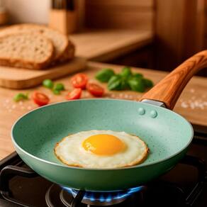 Com 2 frigideiras 26cm e 24cm , esse conjunto une tecnologia cerâmica de ponta, que proporciona cozimento uniforme e saudável, com um visual encantador: acabamento verde sofisticado com cabos amadeirados em Baquelite siliconado que não aquecem. A espessura de 2mm permite que o calor se espalhe de forma eficiente, mantendo os alimentos no ponto certo. Seu revestimento cerâmico antiaderente classificação A pelo Inmetro é livre de metais pesados, tornando o preparo mais seguro e sem necessidade de gordura em excesso.