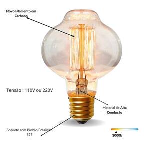 potência: 40w voltagem: 220v vida útil: 25. 000 horas temperatura de cor: 3000k branco quente fluxo luminoso: 160 lúmens lm ângulo de abertura: 360º fator de potência: 0. 4 soquete: e-27 padrão cor do soquete: prata cromado lente vidro : âmbar