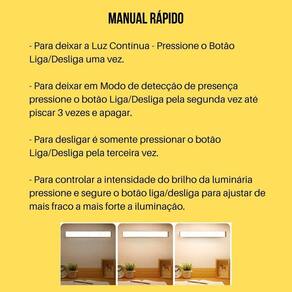 2 Lâmpadas Led 5W Barra 50Cm USB Sensor De Presença Adesivos Magnéticos Com Luz Branco Quente Para Closets Armários Luminária LED com formato de barra, com carregamento via USB, é ideal para serem utilizadas em guarda-roupas, armários, gavetas, corredores, varandas, escritórios, quartos, estantes, cabeceiras de camas, toaletes, espelhos, nichos, closets, escadas, balcões, escrivaninhas e em vários locais que necessitam de iluminação sem a necessidade de perfurações, parafusos e cabos. Especificações do produto:- Tensão de Entrada: DC 5V- Quantidade de Led: 44 LEDs- Cor do Produto: Branco- Cor da Luz: Branco Quente 3000K - Potência nominal: 0.5 a 5W- Corrente nominal: 0.3-1A- Ângulo de Indução: Até 120º- Distância da detecção de movimento: Até 4 metros- Material do produto: ABS e Alumínio- Dimensões do produto: Comprimento: 50cm x Largura: 2,4cm x Espessura: 2cm- Medida do cabo USB: Comprimento: 20cm- Tempo de carregamento: Entre 2 a 3 horas - No carregamento da luminária quando a luz vermelha apagar já está totalmente carregada- Peso da luminária: Aproximadamente 115 gramas cada peça- Duração da luz contínua: Até 3 horas e meia Atenção: Esse produto não é a prova de água, e também, não deverá ser instalado em lugar úmido. Não deverá ser ligada diretamente na energia elétrica 110/220v sem uma fonte de carregamento de 5v, caso contrário, o produto será danificado. Não acompanha nenhuma fonte de carregamento. Manual Rápido- Solte e cole um dos lados da fita dupla face na fita de metal, encoste agora a fita de metal na parte magnética da luminária, por fim solte a outra parte da fita dupla face e fixe no lugar desejado. Observe se o lugar está limpo e adequado para a fixação.- Para deixar a Luz Contínua - Pressione o Botão Liga/Desliga uma vez.- Para deixar em Modo de detecção de presença pressione o botão Liga/Desliga pela segunda vez até piscar 3 vezes e apagar. A luz permanece ligada após a saída de uma pessoa da área do sensor por 25 segundos.- Na função de sensor de presença, a luminária não acenderá se tiver luz por perto, ela acende somente no escuro.- Para desligar é somente pressionar o botão Liga/Desliga pela terceira vez.- Para controlar a intensidade do brilho da luminária pressione e segure o botão liga/desliga para ajustar de mais fraco a mais forte a iluminação. Itens inclusos:- 2 Luminárias com Sensor de Presença- 2 Cabos USB Tipo V8 para carregamento das luminárias- 4 Adesivos Magnéticos para fixação das luminárias no lugar desejado