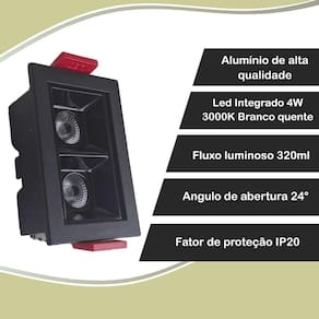 Um spot mini recuado duplo com LED integrado em branco quente é uma excelente escolha para quem busca uma iluminação discreta, eficiente e elegante em ambientes internos. O spot é recuado, ou seja, fica embutido no teto, oferecendo um visual limpo e discreto. O formato duplo permite dois pontos de luz em um único módulo, otimizando o espaço, por ser recuado e possuir dois focos de luz, o spot garante uma iluminação bem distribuída, evitando sombras fortes ou áreas mal iluminadas.