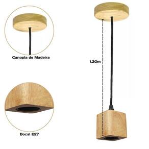 Especificações do Pendente: - Materiais do Pendente: Madeira e fio - Modelo: Pendente Quadrado - Cabo ajustável - Bocal de madeira com rosca E27 - Voltagem: Bivolt - Potência máxima por pendente: Até 50W - Base para fixação no teto: Metal - Tampa/Canopla: Redonda de madeira - Fiação: Fio PP com Acabamento em tecido - Acompanha peças para montagem e instalação do produto - Indicado para uso: Interno