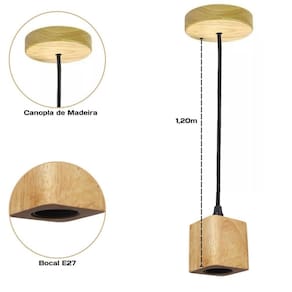 Especificações do Pendente: - Materiais do Pendente: Madeira e fio - Modelo: Pendente Quadrado - Cabo ajustável - Bocal de madeira com rosca E27 - Voltagem: Bivolt - Potência máxima por pendente: Até 50W - Base para fixação no teto: Metal - Tampa/Canopla: Redonda de madeira - Fiação: Fio PP com Acabamento em tecido - Acompanha peças para montagem e instalação do produto - Indicado para uso: Interno