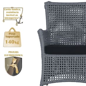 A corda nautica adiciona um toque de rusticidade moderna, enquanto o estofado impermeavel garante que sua poltrona esteja sempre impecavel, mesmo apos uma chuva inesperada ou um acidente com liquidos.