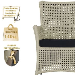 A corda nautica adiciona um toque de rusticidade moderna, enquanto o estofado impermeavel garante que sua poltrona esteja sempre impecavel, mesmo apos uma chuva inesperada ou um acidente com liquidos.