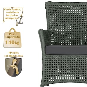 A corda náutica adiciona um toque de rusticidade moderna, enquanto o estofado impermeável garante que sua poltrona esteja sempre impecável, mesmo após uma chuva inesperada ou um acidente com líquidos.