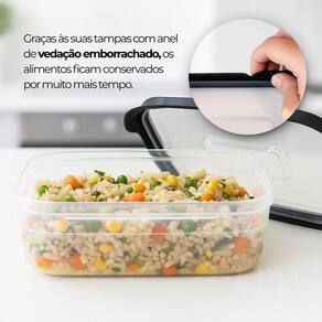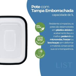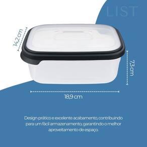 2 Pote Transparente tampa preta 1000ml Kit 2 Potes Retangulares 1000ml Preto com Tampa Vedada O kit com 2 potes retangulares de 1000ml na cor preta oferece praticidade, resistência e ótimo aproveitamento de espaço. Ideal para armazenar marmitas, alimentos em porções maiores ou organizar a geladeira e o freezer. Cada pote possui tampa com vedação firme, que ajuda a conservar os alimentos por mais tempo e evita vazamentos. O material é plástico atóxico, resistente a impactos e próprio para uso no dia a dia. Os potes podem ser utilizados com segurança no micro-ondas, freezer e lava-louças. Características: Capacidade de 1000ml por pote Tampa com vedação emborrachada Indicado para armazenar alimentos e marmitas Pode ser no micro-ondas, freezer e lava-louças Cor preta com acabamento moderno Material resistente e durável Dimensões de cada pote: Altura: 73 mm Largura: 189 mm Comprimento: 142 mm Conteúdo da embalagem: 2 potes plásticos retangulares de 1000ml com tampa Deseja isso também Marca: Não Informado Ean: 7802897762664