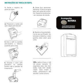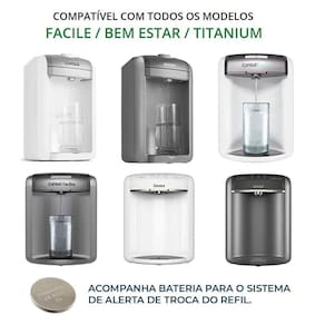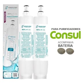Kit 2 refis premium purificador consul cpc30 cpc31 cpb34 cpb35 cpb36... Refil premium + bateria para purificadores de água consul Compatível com todos os modelos:Facilite e bem estarCpc30 / cpc35 / cpc36 (similar ao refil cix01ax)Cpc31 / cpb34 (similar ao refil cix06ax) Vantagens 01 refil = 7.000 garrafas de 500 ml Redução do cloro Grau de filtração: classe c Retenção de partículas Cada filtro acompanha uma bateria nova para garantir o bom funcionamento do sistema de alerta de troca do filtro refil (somente os modelos cpc30 e cpc 31 utilizam a bateria, pois não são ligados na tomada). Fazer a troca do filtro é realmente muito simples e leva cerca de 3 minutos. Junto dos filtros nós enviamos também nosso manual exclusivo com as instruções passo a passo de como fazer a troca. Nas instruções enviadas nós informamos como reiniciar a contagem da vida útil do refil, mas para saber como é fácil, siga esses passos:- modelo bem estar: pressione a tecla vida refil ao lado da bateria por 3 segundos, até ouvir o aviso sonoro confirmando a troca.- modelo facilite: retire o cabo elétrico da tomada, após alguns segundos ligue o cabo elétrico na tomada e pressione os botões de água gelada e natural simultaneamente por cerca de 5 segundos até ouvir o aviso sonoro confirmando a troca. O filtro remove o cloro da água, elimina sabores, retém partículas de sujeira, barro, ferrugem, eleva o ph, além de eliminar 96% de bactérias e micróbios. As marcas e produtos citados e ilustrados são propriedades de seus respectivos fabricantes e aparecem apenas para demonstrar a compatibilidade deste produto. Informações técnicasTemperatura de operação: 1c mín./40c máx.Pressão de operação: 29,4 kpa mín. A 392,3 kpa máx.Composição: polipropileno e carvão ativado granulado.Grau de filtração: classe c ( 5 a 15 micra)Vazão máxima: 50 l/hPeso líquido: 0,172 kgPeso bruto: 0,224 kgDimensionais (axlxp):258 mm x 53 mm x 53 mmDimensionais emb. (axlxp):295 mm x 55 mm x 55 mmCom redução do cloro livre de no mínimo 75%Retenção de partículas Obs.: a consul não fabrica filtros e sim compra de fabricantes e coloca sua marca. A hidrofiltros e o principal fabricante de filtros da america latina. Possuindo os refis com os melhores desempenhos do mercado.