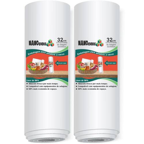 2 Rolos Nanocubos 32x500cm Embalagem Ranhura Seladora Vácuo Embalagem 2 rolos Nanocubos 32 cm X 500 cm para seladoras a vácuo. Embalar produtos a vácuo é a melhor forma de mantê-los sempre protegidos por muito mais tempo. Ao embalar alimentos, a validade deles é completamente estendida, pois eles não terão nenhum contato com o ar e serão pouco afetados pela ação do tempo. Você pode embalar tanto alimentos crus como alimentos já preparados para serem consumidos em outro momento. Você economiza muito dinheiro e evita o desperdício Os sacos para vácuo Nanocubos são produzidos com alta tecnologia em Nylon Poli seguindo padrões de qualidade internacional. Possuem 12 micras, 3 barreiras de proteção, sem presença de BPA Não tóxicos e funcionam com equipamentos de embalagens a vácuo. Além de alimentos, é possível utilizá-lo com objetos pessoais, documentos ou utensílios, conservando-os como novos por muito tempo e aumentando sua vida útil.