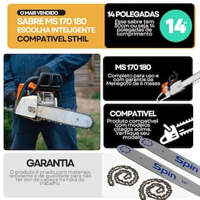 Comprimento: 14 35 cm Passo da corrente: 3/8 Espessura do canal: 1.1 mm 0.043 Dentes: 25 Material: Aço de alta resistência com tratamento anticorrosivo Encaixe: Compatível com Stihl MS 170, MS 180 Tipo de ponta: Rolante menor atrito, maior vida útil