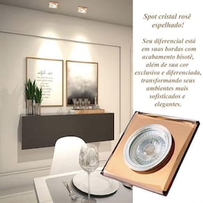 - Material: Cristal espelhado rosê e alumínio Dimensões: Comprimento: 9 cm Largura: 9 cm Altura: 0,8 cm Recorte no teto : 7 cm - Soquete: GU10 incluso - Modelo da lâmpada: MR16 - LED - Dicroica - Quantidade de lâmpadas: 01 - Potência máxima: 50W