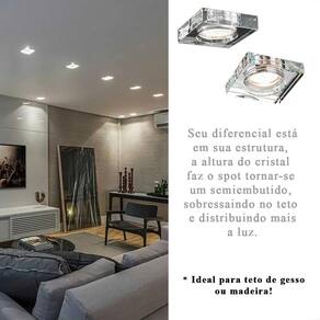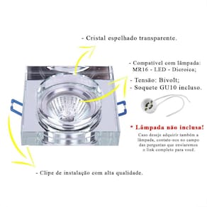 - Material: Cristal espelhado transparente e metal cromado - Dimensões: L 8,9 cm x C 8,9 cm A 2 cm - Recorte no teto :7x7 - Quantidade de lâmpadas: 01 - Bocal: GU10 - Modelo da lâmpada: MR16 - Potência máxima: 50W