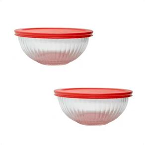 2 tigelas vidro borossilicato canelada com tampa vermelha 1000ml