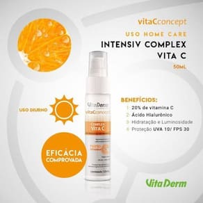 Vita Derm Vita C Concept Complex Sérum de Linhas para todos os tipos de pele. vita Derm Vita C Concept Complex atua na melhora da firmeza, elasticidade, uniformizador de manchas e iluminação da pele. Sérum Vita Derm Vita C Concept Complex traz uma fórmula com a combinação de ácido hialurônico, silício e vitamina C pura, que oferece poderosa ação de Linhas e revitalização da pele. Além disso, possui toque seco e FPS 30, para proteger da ação do sol. Um produto multifuncional de uso diário para potencializar e facilitar a sua rotina de skincare. Marca: Não Informado