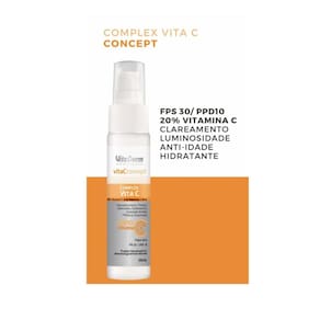 Complex Vita C é um fotoprotetor multifuncional com FPS30/UVA10 com 20% de vitamina C e ácido hialurônico que protege a pele das agressões da radiação solar, hidrata e uniformiza a tonalidade da pele. Possui eficácia antioxidante que ajuda a preservar o colágeno da pele. Uso diário. Rotina diurna. Marca: Não Informado