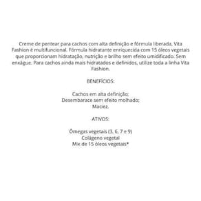 Creme de pentear para cachos com alta definição e fórmula liberada, Vita Fashion é multifuncional. Fórmula hidratante enriquecida com 15 óleos vegetais que proporcionam hidratação, nutrição e brilho sem efeito umidificado. Sem enxágue. Para cachos ainda mais hidratados e definidos, utilize toda a linha Vita Fashion.