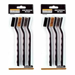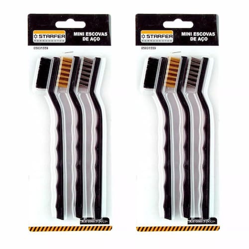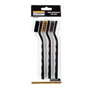 Jogo com 3 pecas: 1 com cerdas em aço carbono, 1 com cerdas em latão e 1 com cerdas em nylon.