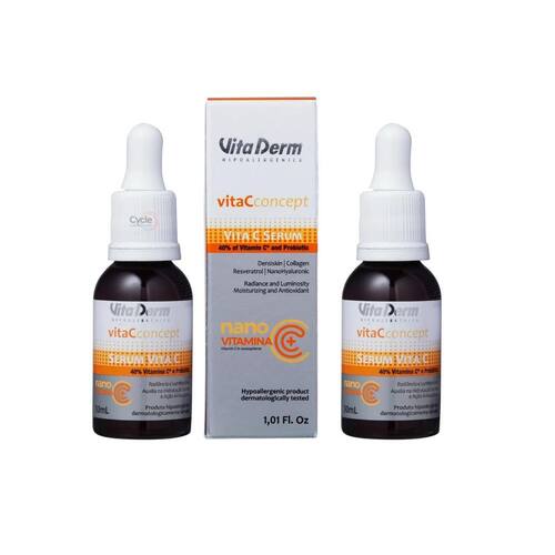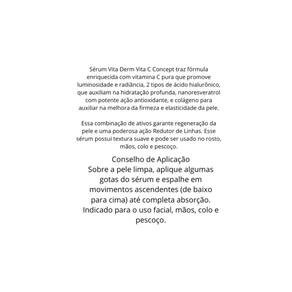 Vita Derm Vita C Concept Sérum de Linhas para todos os tipos de pele. vita Derm Vita C Concept promove hidratação, revitaliza a pele e uniformiza o tom. Sérum Vita Derm Vita C Concept traz fórmula enriquecida com vitamina C pura que promove luminosidade e radiância, 2 tipos de ácido hialurônico, que auxiliam na hidratação profunda, nanoresveratrol com potente ação antioxidante, e colágeno para auxiliar na melhora da firmeza e elasticidade da pele. Essa combinação de ativos garante regeneração da pele e uma poderosa ação de Linhas. Esse sérum possui textura suave e pode ser no rosto, mãos, colo e pescoço. Marca: Não Informado Ean: 07898560460050