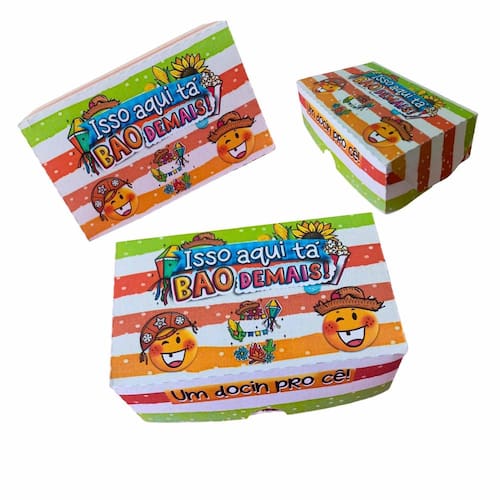 Deixe sua Festa Junina ainda mais especial com as Caixas para Docinhos Kibunitinho Perfeitas para embalar doces, lembrancinhas e mimos juninos, nossas caixas versáteis acomodam até 6 unidades e trazem toda a alegria e tradição da festa para sua mesa. Com design exclusivo e 3 opções de estampas temáticas juninas, impressão de alta qualidade em papel offset 240g fosco e acabamento impecável, elas dão um toque de charme e autenticidade à sua celebração. O kit inclui: 20 caixas desmontadas com a mesma estampa você escolhe a estampa no momento da compra Dimensões: 12cm comprimento x 8cm largura x 4cm altura Características: Impressão de alta qualidade em papel offset 240g fosco 3 opções de estampas temáticas juninas vibrantes e acabamento gráfico fosco Montagem fácil e rápida por encaixe sem necessidade de cola Versatilidade para embalar diversos tipos de doces e lembrancinhas P: as caixas são enviadas montadas R: não, as caixas são enviadas desmontadas para garantir que cheguem intactas até você. A montagem é simples e rápida, sem necessidade de cola. P: posso escolher a estampa das caixas R: sim Oferecemos 3 opções de estampas juninas exclusivas. Selecione a sua preferida no momento da compra. P: posso personalizar as caixas com meu logo Encante seus convidados com embalagens criativas e cheias de tradição Marca: Não Informado