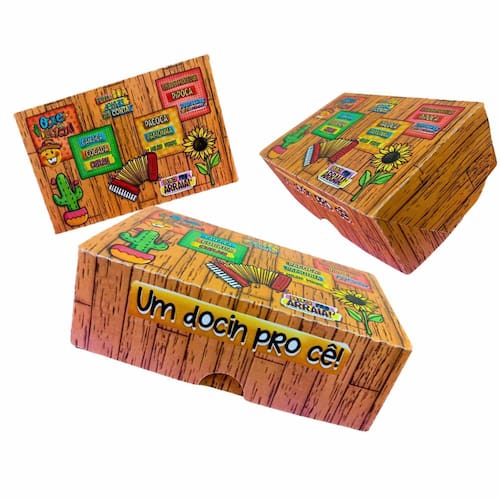 Impressão de alta qualidade em papel offset 240g fosco 3 opções de estampas temáticas juninas vibrantes e acabamento gráfico fosco Montagem fácil e rápida por encaixe sem necessidade de cola Versatilidade para embalar diversos tipos de doces e lembrancinhas