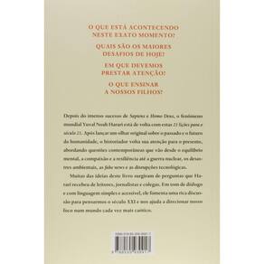 "O novo livro do autor de Sapiens e Homo Deus explora as grandes questões do presente e o que podemos fazer para melhoráloo podemos nos proteger de guerras nucleares, cataclismos ambientais e crises tecnológicas? O que fazer sobre a epidemia de fake news ou a ameaça do terrorismo? O que devemos ensinar aos nossos filhos?Em Sapiens, Yuval Noah Harari mostrou de onde viemos; em Homo Deus, para onde vamos. 21 lições para o século 21 explora o presente e nos conduz por uma fascinante jornada pelos assuntos prementes da atualidade. Seu novo livro trata sobre o desafio de manter o foco coletivo e individual em face a mudanças frequentes e desconcertantes. Seríamos ainda capazes de entender o mundo que criamos?"