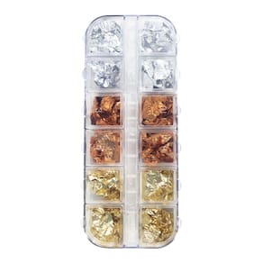 01 - embalagem com 12 divisórias, 4 com folhas de bronze, 4 com folhas de prata, 4 com folhas de ouro 01 - embalagem com 12 divisórias, cada divisória com uma cor incrível de folhas.