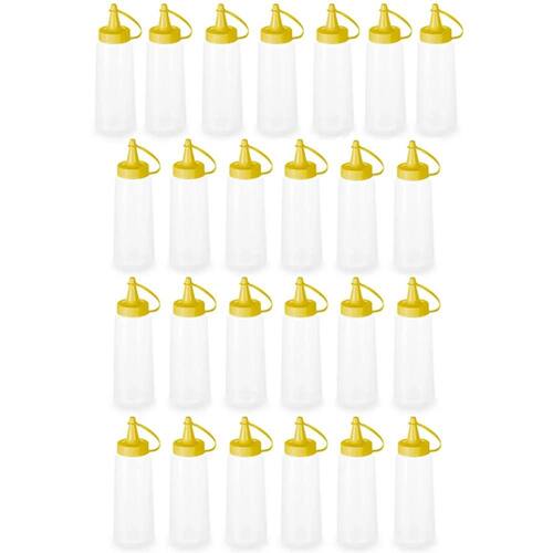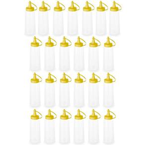 Garantia: 90 dias / Peso: 800g / Cor predominante: transparente / Ref: 7798139234177; Dimensões de cada bisnaga: 5cm (D) x 17cm (A); Dimensões de cada tampa: 3cm; Capacidade de cada bisnaga: 250ml; Material: plástico polipropileno (PP); Conteúdo: 25 bisnagas plásticas 250ml.