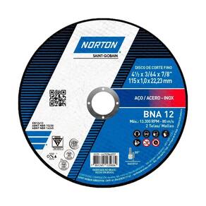 Características Adicionais: escolha ideal para quem busca cortes precisos e seguros em aço carbono e inox. Com duas telas de reforço e tipo 41, proporciona maior rendimento e conforto durante o uso. Com certificação ISO 9001-2000, este disco garante alta qualidade e eficiência em suas aplicações. Descubra como essa ferramenta de alta qualidade pode facilitar suas tarefas de manutenção e reparo. Realize cortes com facilidade e segurança em suas manutenções e reparos, garantindo resultados impecáveis. Obtenha cortes precisos e eficientes em aço carbono e inox com o Disco de Corte Linha Azul BNA12 da Norton.
