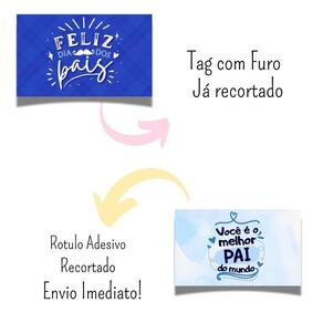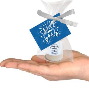 25 frascos de vidro com hidratante Kaiak 30ml cada 25 etiquetas com tema Dia dos Pais 25 tags com furo 25 fitas de cetim azul ou branca, conforme disponibilidade 25 saquinhos de celofane para um acabamento elegante