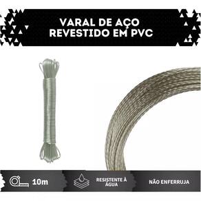 2un Varal cabo aço revestido Corda 2x10m parede e teto Você não precisa mais se preocupar com o varal arrebentar a toda hora, pois ele é feito em aço e encapado com termoplástico, não enferruja além de proteger a roupa e vai durar muito mais tempo, resistente e de bom tamanho O cabo de aço revestido é uma excelente opção na das cordinhas comuns de varal de teto e na montagem de varais de parede. Cor: transparente Metragem: 10m Benefícios: - Produto reforçado - Revestido em PVC - Maleável - Fácil instalação - Acabamento liso e uniforme - Pode ser em paredes, em varais de teto Marca: Não Informado