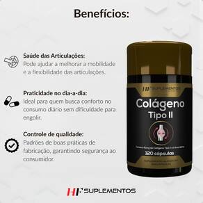 Suplemento alimentar de colágeno tipo ii Recomendações de uso: ingerir 2 cápsulas ao dia ou conforme a orientação médica ou nutricional. Através deste anúncio, você está adquirindo 2 dois potes de colágeno tipo ii 120 cápsulas hf suplementos Ingredientes: colágeno tipo ii não desnaturado. Antiumectante: dióxido de silício. Excipiente: amido de milho. Composição da cápsula: gelatina e umectante glicerin Produto indicado para o grupo populacional = 19 anos. Este produto não é um . Não exceder a recomendação diária de consumo indicada na embalagem. Mantenha fora do alcance de crianças. Modo de conservação: mantenha o frasco firmemente fechado. Conservar este produto ao abrigo de luz, calor e umidade. Está embalagem foi selada para a sua proteção. Não utilize o produto no caso de violação. Após aberto consumir em até 60 dias. Marca: Não Informado