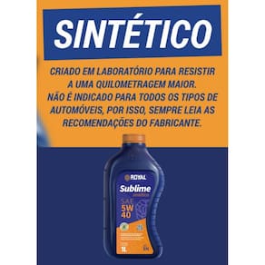 O óleo lubrificante 5W40 Royal Sublime Sintético é um tipo de óleo de motor especialmente formulado para oferecer alto desempenho e proteção para motores a gasolina e a diesel. Aqui estão algumas características e benefícios desse tipo de óleo: