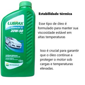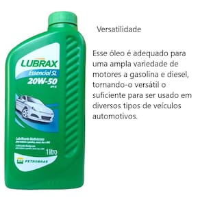 O óleo Lubrax SL Essencial Automotivo 20W50 é um tipo de lubrificante projetado especificamente para motores de carros. Ele possui uma viscosidade de 20W50, o que significa que é adequado para uso em uma variedade de condições climáticas e temperaturas. Aqui está uma descrição mais detalhada deste óleo para motor de carro: Viscosidade: O número 20W50 indica a viscosidade do óleo. O 20 refere-se à viscosidade do óleo a baixas temperaturas, o que ajuda na partida a frio do motor. O 50 indica a viscosidade do óleo a altas temperaturas, garantindo a proteção adequada do motor sob cargas e temperaturas elevadas. Lubrificação: O óleo Lubrax SL Essencial Automotivo 20W50 é formulado para fornecer uma camada de lubrificação eficaz entre as peças móveis do motor, reduzindo o atrito e o desgaste, prolongando assim a vida útil do motor. Proteção contra desgaste: Este óleo é projetado para oferecer proteção contra o desgaste das peças internas do motor, como pistões, anéis, bielas e mancais. Isso ajuda a manter o desempenho do motor ao longo do tempo. Limpeza do motor: O Lubrax SL Essencial Automotivo 20W50 também possui aditivos que ajudam a manter o motor limpo, evitando depósitos de sujeira e lama, o que pode prejudicar o desempenho do motor. Estabilidade térmica: Ele é formulado para manter sua viscosidade estável em altas temperaturas, o que é fundamental para garantir a proteção do motor sob condições de uso intensivo. Aplicação: Este óleo é adequado para uma ampla gama de motores a gasolina e diesel, sendo versátil o suficiente para ser em diversos tipos de veículos automotivos. Lembrando que é importante verificar o manual do proprietário do seu carro para garantir que o Lubrax SL Essencial Automotivo 20W50 seja o óleo recomendado para o seu veículo, pois as especificações de óleo podem variar entre diferentes modelos e marcas de carros. Além disso, é fundamental seguir as recomendações de troca de óleo estabelecidas pelo fabricante do veículo para manter o motor em bom estado de funcionamento. Marca: Não Informado