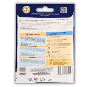 Características * Germinação: 7 a 14 dias. * Sementes por grama: 200 à 220. * Plantio: Clima Quente * Tipo da embalagem: Envelope 2,5g * Nome científico: Capsicum Chinese * Profundidade: 1cm / 3cm entre sementes * Transplantio: 25 a 30 dias após a germinação. * Colheita: 130 a 150 dias após a semeadura. * Kit com 2 Envelopes de 2,5g cada.