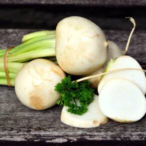 Descrição * Nome Científico: Beta vulgaris L. * Beterraba de coloração branca como a neve e arredondada.* Possui um alto índice de açúcar, com o diâmetro de 5-10 cm. * Suas folhas são verdes claras e eretas.