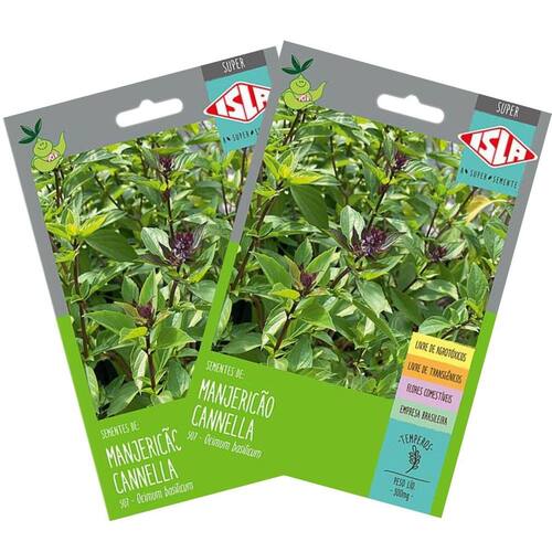 Descrição * Nome Científico: Ocimum basilicum L. * O Manjericão Cannella é uma variedade nativa do México que veio fazer parte da linha Cor-de-horta e fazer você plantar diferente * As flores roxas são comestíveis e fazem dele uma erva perfeita para enfeitar e aromatizar pratos e infusões frias. * A planta gosta de sol direto e solo bem drenado, levemente úmido e adubado. * Se desenvolve super bem em vasos, jardineiras e canteiros.* Também pode ser colhido na sua forma jovem, em forma de microverdes ou baby leafs. * Variedade nativa do México com aroma de especiaria que faz lembrar canela. * Folhas ovais ligeiramente dentadas com flores roxas comestíveis. * Perfeito para enfeitar e aromatizar os mais variados pratos e infusões frias. * Facilmente cultivado em vasos, jardineiras e canteiros. * Indicado também para colheita jovem/antecipada (microverdes e de folhas jovens).