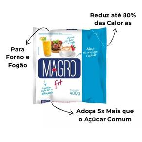 Transforme suas receitas sem culpa com o Açúcar Magro Fit 400g Este adoçante de mesa em pó é uma alternativa perfeita para quem busca reduzir a ingestão de açúcar sem sacrificar o sabor. Cada colher sopa de açúcar Magro equivale a 5 colheres sopa de açúcar comum, o que significa que você pode desfrutar do mesmo doce sabor enquanto reduz até 80% das calorias.