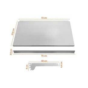 - largura da bandeja: 73cm; - profundidade da bandeja: 40cm; - limite de carga em cada bandeja: 35 kg; - estrutura: chapa em aço carbono, com pintura epóxi branca. - medidas totais: 3cm a x 73cm l x 37,5cm p.